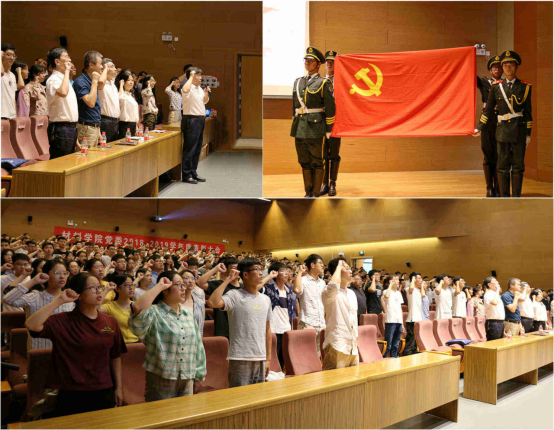 最后,国护同学护卫党旗上台,由院长胡文彬同志领誓,全场起立重温入党誓词。院长胡文彬带领师生党员,面对鲜红党旗,庄严举起右拳,以铿锵有力的声音向党旗宣誓:“我志愿加入中国共产党,拥护党的纲领,遵守党的章程,履行党员义务,执行党的决定,严守党的纪律,保守党的秘密,对党忠诚,积极工作,为共产主义奋斗终身,随时准备为党和人民牺牲一切,永不叛党!”