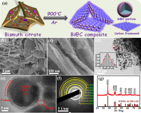 图1铋@碳复合物的(a)制备过程,(b-c)SEM图像,(d-e)TEM图像,(f)SAED图,(g)XRD谱图