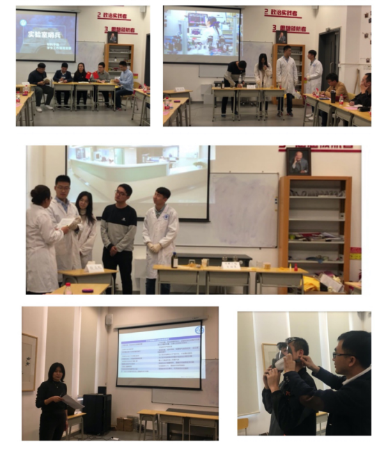 随后,材料学院学生工作组党支部和本科生第二党支部党员代表联合表演了情景剧“实验室哨兵”,也是本次联合党日活动中的特色环节。不同于传统形式上的安全文化教育,此次情景剧的参演同志将实验安全、生活安全等多方面隐患以故事形式展现出来,主线突出,变“纸上谈兵”为“实战演练”,生动形象地使安全教育深入内心。情景剧结束后,学生党员以竞答形式指出情景剧中的错误做法并总结分享实验室安全的正确做法。资产处张磊同志、李春鸽同志对学生党员的回答以及典型实验室安全问题进行了点评,并亲自向学生党员示范如何正确穿戴实验室常用的手套、口罩、防毒面具等防护设备。