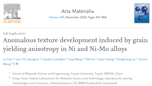 天津大学材料学院金属结构材料研究团队与瑞士联邦材料科学与技术实验室合作,在针对镍及镍-钼合金的研究中,惊奇地发现热处理导致了几乎完美的{110}织构的形成。研究团队通过构建定量热力学模型,系统地揭示了反常{110}织构形成的原因:在较大热错配应力驱动下,镍晶体屈服各向异性导致其[110]取向的晶粒相对其它取向优先发生塑性形变,从而降低体系总能量并发生{110}织构择优生长。该工作为通过材料设计和织构调控获得新型结构与功能材料提供了思路,相关研究成果近期以“Anomalous texture development induced by grain yielding anisotropy in Ni and Ni-Mo alloys”为题发表于Acta Materialia 200 (2020) 857-868。