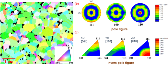 图2. 700℃下退火后镍薄膜的(a)EBSD取向图和(b)极图和(c)反极图。