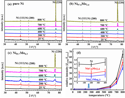 图1.(a)Ni,(b)Ni97.6Mo2.4,(c)Ni93.7Mo6.3在不同温度下退火XRD衍射图,(d)(220)和(111)衍射峰强度比随温度的变化。