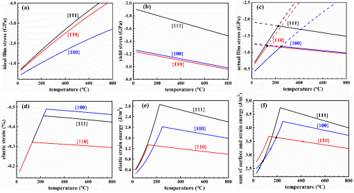 图3.镍薄膜中(a)理论总应力(初始残余应力与热应力之和)、(b)不同取向晶粒的屈服强度、(c)真实应力、(d)弹性应变、(e)弹性应变能以及(f)表面能与弹性应变能总和随温度的变化。