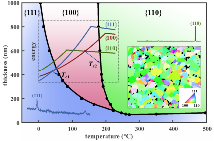 在晶粒屈服各向异性模型计算的基础上,研究组构建了基于镍薄膜{111}、{100}和{110}织构的“织构图”(图4),可以预测不同膜厚下各种织构间的转变温度。该模型已被成功应用于铜、铝等不同纯金属体系,并且可以广泛扩展到其他半导体与合金体系。
