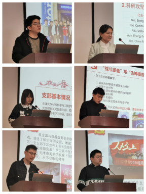在本次支部书记述职评议考核中,本科生和研究生共24个基层学生党支部书记依次上台,从支部情况、三会一课、支部作用发挥情况、特色工作及主要问题和改进措施等方面做出介绍,汇报这一年以来支部建设的工作成果,总结党建工作的成就和不足。展示过程中,各党支部书记实事求是地介绍了相关情况以及支部内存在的问题和解决措施,涌现了支部建设中的一些好做法、好点子。例如,材料学院2019级硕士生材加党支部书记许全军在疫情期间联合华中科技大学、武汉大学和智算学部学生党支部开展了“众志成城战疫情,凝心聚力筑家园”专题党课学习,返校后联合焊接所教工党支部和天津大学研究生支教团共同发起了“材梦课堂”云端筑梦活动助力教育扶贫。材料学院本科生第一党支部副书记杨昕怡坚持在支部传统活动的基础上,加大支部在宣传师生、服务师生方面的作用发挥,打造本科生支部的鲜明特色和优势,重视支部党员的日常监督和管理,筑牢支部“自身建设和服务群众两手抓,两手都要硬”的建设原则。材料学院博士生金属第三党支部书记王禹轩将支部工作和科研相结合,依托“纳米及复合材料研究组”“圆的方块”“灰色脑细胞”“白鸽的小文字”微信公众号,分享理论时政热点、学术科研成果、党员成长点滴等方面内容,通过微视频、微党课、微心得等形式开展网络思想政治教育,引起支部内外热烈反响。各党支部书记均表示在今后工作中要切实履行支部书记责任,发挥支部战斗堡垒作用。