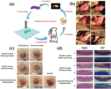 图2.(a) 3D打印 PNAGA水凝胶半月板替代物及植入示意图;(b) 半月板替代物植入手术流程;(c) 术后4 w,股骨与胫骨关节软骨的大体观察图片;(d) 术后4 w,股骨与胫骨关节软骨的组织学分析(标尺:500 μm)