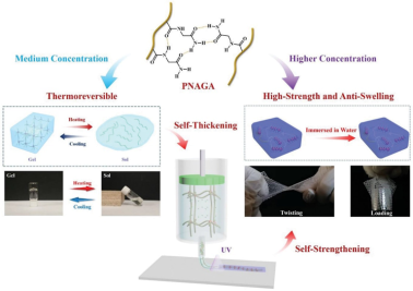 图1.自增稠/自增强3D打印高强度PNAGA超分子聚合物水凝胶示意图