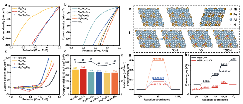 在大量前期工作的基础上,金属功能材料研究团队精心构建了一个由Ni2Al3和Ni3Fe相组成的自立式杂化体系。如图1所示,通过在泡沫镍上激光辅助铝(Al)掺入合金及随后的脱合金化来实现有效的全水裂解。其中,Ni和Fe的合金化可以实现了对其电子结构的调节,导电的Ni3Fe又促进了电荷转移,同时,Al掺杂形成的Ni2Al3相具有较高的HER活性。在此项研究中,我们所提出并实施的激光直写(Laser-Direct-Writing)技术具有加工速度快、生产成本低等优点,在催化剂涂层和基材之间的界面上可实现牢固的冶金结合,确保电极的长期耐用性。此外,用激光将催化剂结合到泡沫镍上所形成自支撑结构,可以增加催化剂的导电性,改善其稳定性。实验研究结果如图2所示,Ni18Fe12Al70具有极低的过电位来触发HER(η100=188 mV)和OER(η100=345 mV)过程,可与最先进的电催化剂相媲美。理论计算结果表明,Ni2Al3和Ni3Fe合金在异质结处发生了H原子的共吸收,使势垒降低到0.081 eV,从而证实了Ni2Al3和Ni3Fe合金在HER过程中的协同作用。此外,该催化剂在100和400 mA cm-2的大电流密度下均能保持稳定的过电位达100 h,而双电极碱性水电解槽在1.54 V的槽电压下即可获得10 mA·cm-2的电流密度,同时该电解槽在100 h内表现出良好的电化学稳定性。因此,激光辅助Al掺杂的合金化而触发相工程学是一种获得大规模、低成本生产非贵重金属双功能催化剂的可行方案,在未来实现双功能催化剂的商业化应用具有重要的研究意义。