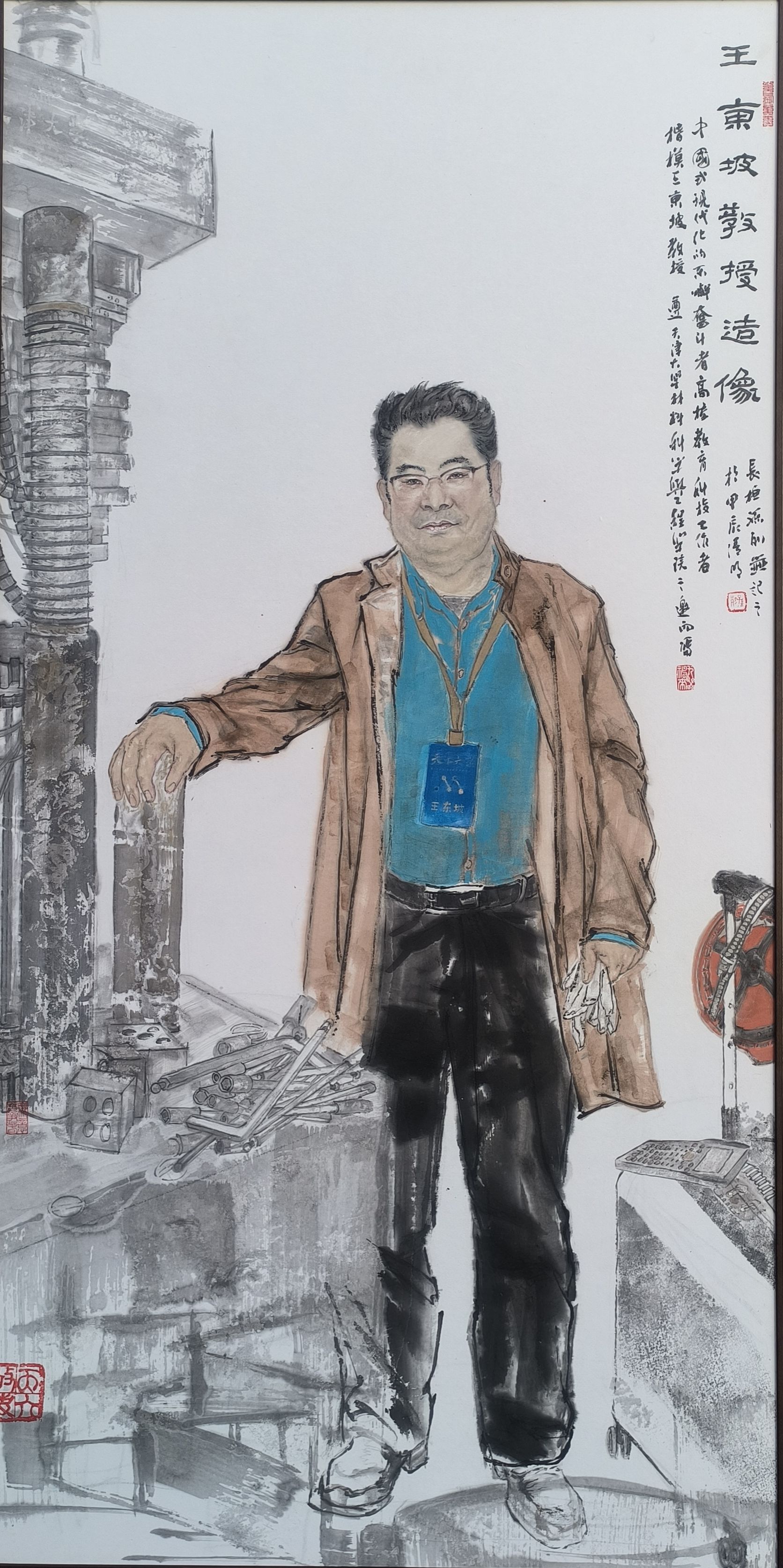 追思会现场,天津大学王学仲艺术研究所所长孙列将历时半年精心创作的中国画《师者 楷模王东坡教授造像》捐赠给材料学院,期冀“实事求是”校风传续绵长。画中,王老师风尘仆仆地从工地赶回实验室投入教学,但仍然激情满满地站在一台实验设备前跟大家聊着科研,旁边是他生前常用的行李箱、计算器……
