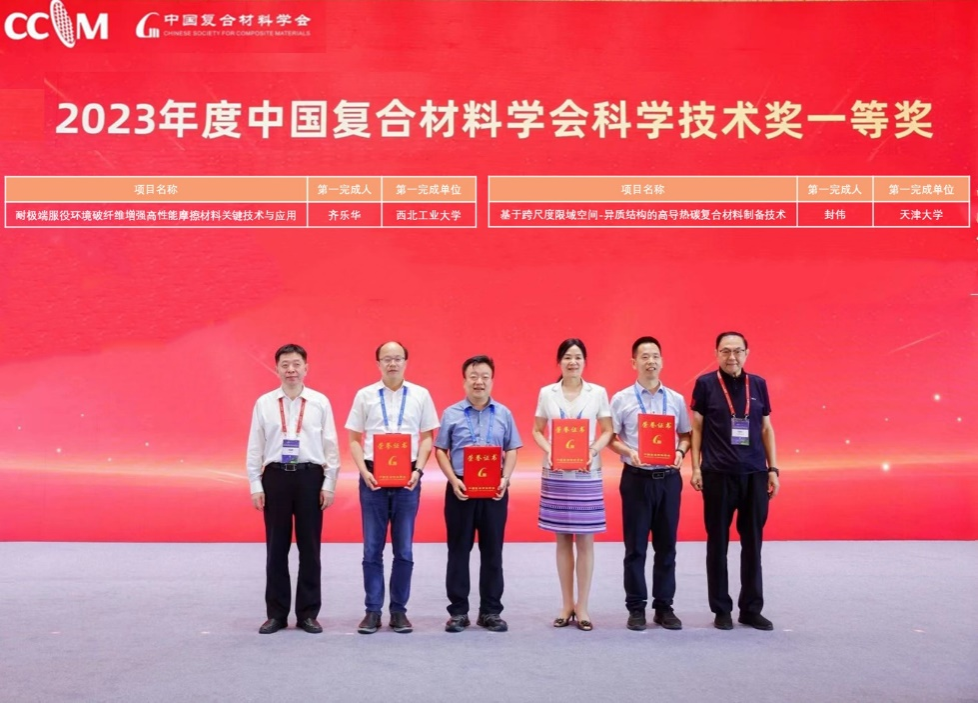 7月27日,2023年中国复合材料学会科学技术奖颁奖典礼在新疆乌鲁木齐国际会展中心举行。中国复合材料学会荣誉理事长、中国工程院院士杜善义教授和中国复合材料学会第八届理事会理事长、中国工程院院士、东华大学校长俞建勇教授共同为获得2023年度中国复合材料学会科学技术一等奖获奖者颁奖(全国共计两项)。其中,天津大学材料学院封伟教授因在导热复合材料方面的显著成就,以第一单位完成人身份荣获2023年度中国复合材料学会科学技术一等奖,项目名称为“基于跨尺度限域空间-异质结构的高导热碳复合材料制备技术”。