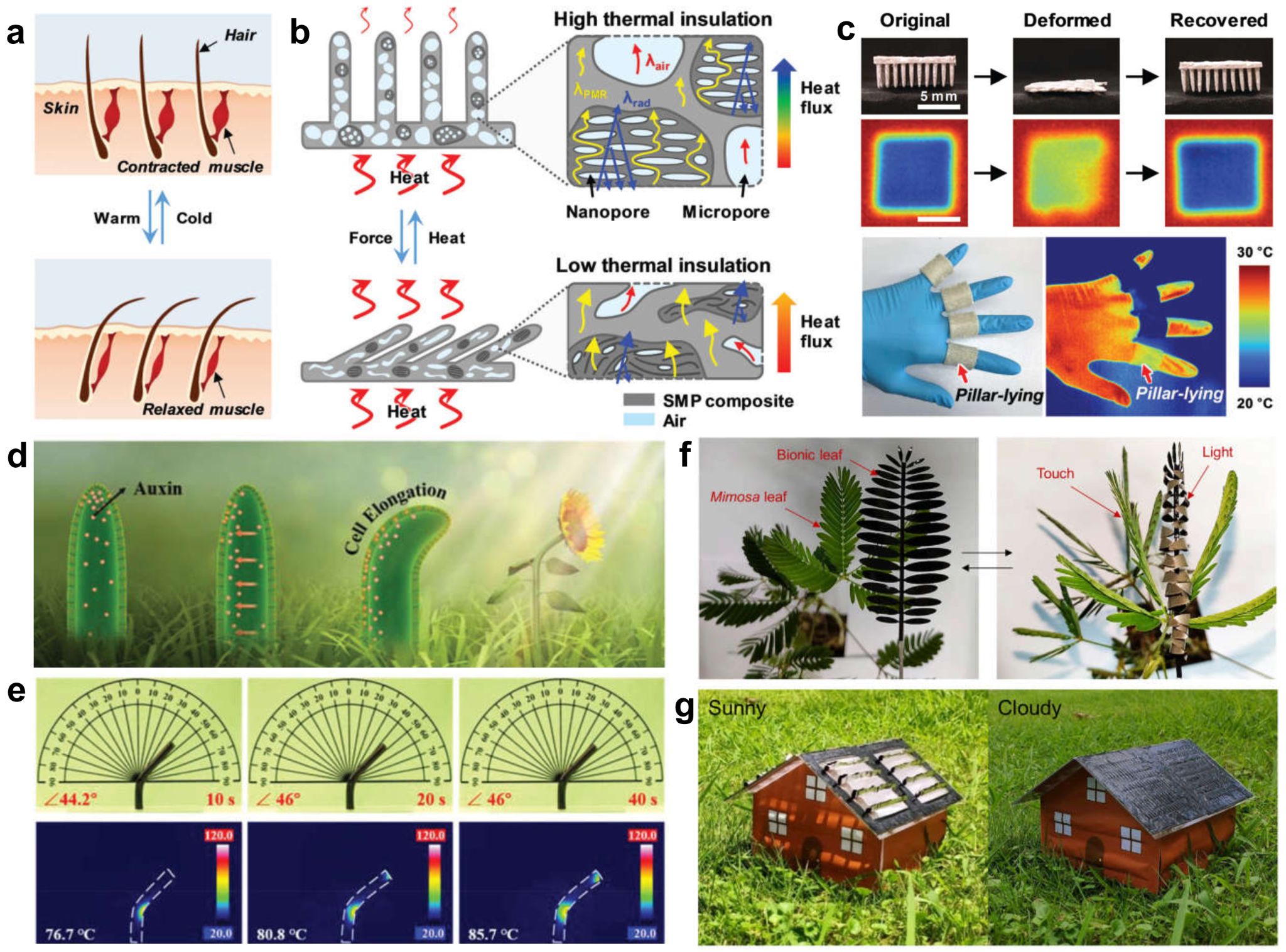 变仿生智能热管理材料基于变形机制的仿生智能热管理材料通过动态调控热传导路径实现高效热管理,其核心在于响应温度、光照或湿度等环境刺激,自主改变材料内部结构以调节热导率与热流分布。该材料可分为热驱动、光驱动及湿度驱动三类:热驱动型通过形状记忆效应模拟生物毛发直立机制,在温度变化下可逆切换微孔结构状态,实现热绝缘性能的动态调控;光驱动型借鉴植物向光性原理,利用光热转换与热致变形耦合效应,构建具有径向温度梯度的仿生执行器,实现全角度光追踪及精准热流定向控制;湿度驱动型则模拟植物吸湿膨胀行为,通过亲疏水基团的可逆相变调节材料膨胀系数,结合非对称热膨胀效应实现湿度响应的双向调温功能。三类材料均通过仿生结构变形实现无源能量输入的自适应热管理。