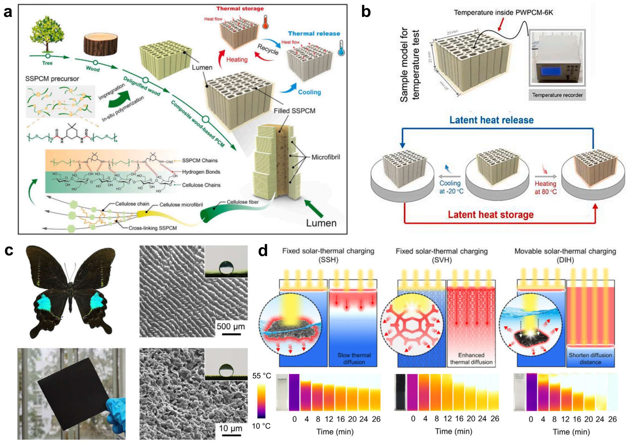 相变型仿生智能热管理材料通过模仿生物相变调控机制,结合相变材料(PCMs)的高储能特性与仿生结构设计,实现高效热能存储与动态温度管理。在相变储能领域,传统材料面临泄漏、体积形变及机械强度不足等挑战,而仿生多孔支架结构(如蝴蝶翅脉启发的多级孔隙网络)通过毛细作用约束液态相变材料,显著提升形状稳定性与热导率,同时生物质衍生材料(如类骨“砖-泥”结构)的引入进一步增强了复合材料的机械强度与热循环耐久性。蒸发热管理方向则通过仿生蒸腾与排汗机制,构建基于水蒸发相变的高效散热系统:植物气孔启发的吸湿光热凝胶可动态调控大气水分捕获与蒸发冷却,实现跨湿度环境的热管理。两类策略均利用相变潜热实现无源热调控,其核心创新在于仿生结构对相变过程的多尺度调控。