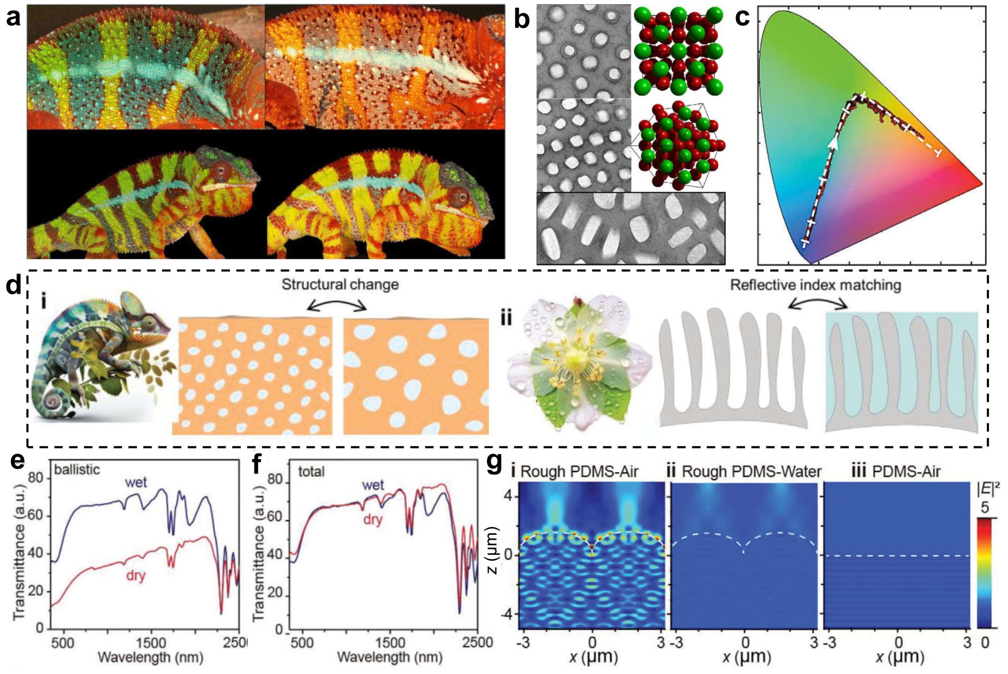 颜色变换仿生智能热管理材料通过仿生机制实现动态光学与热学特性调控,主要分为辐射冷却与红外隐身两类。辐射冷却材料通过仿生光子晶体结构(如变色龙皮肤纳米晶排列、蝴蝶翅脉周期性微结构)优化太阳光反射与红外发射性能,其核心在于可见-近红外波段高反射率(>90%)和中红外大气窗口(8-13μm)高发射率(>90%)的协同设计,从而突破环境温度实现高效降温。红外隐身材料则聚焦动态发射率调控,模仿头足类动物色素囊收缩机制,利用柔性微腔、褶皱表面等仿生结构,通过电/热/机械刺激实时改变表面形貌,实现红外辐射特征与背景的动态匹配,响应时间缩短至毫秒级。两类材料均需解决宽谱段协同调控难题,需结合多层结构、多物理场耦合机制实现全光谱管理。未来发展方向包括提升材料在极端环境下的耐久性、优化动态响应速度,以及通过智能算法实现自适应精准调控,推动其在建筑节能、军事伪装等领域的实用化进程。