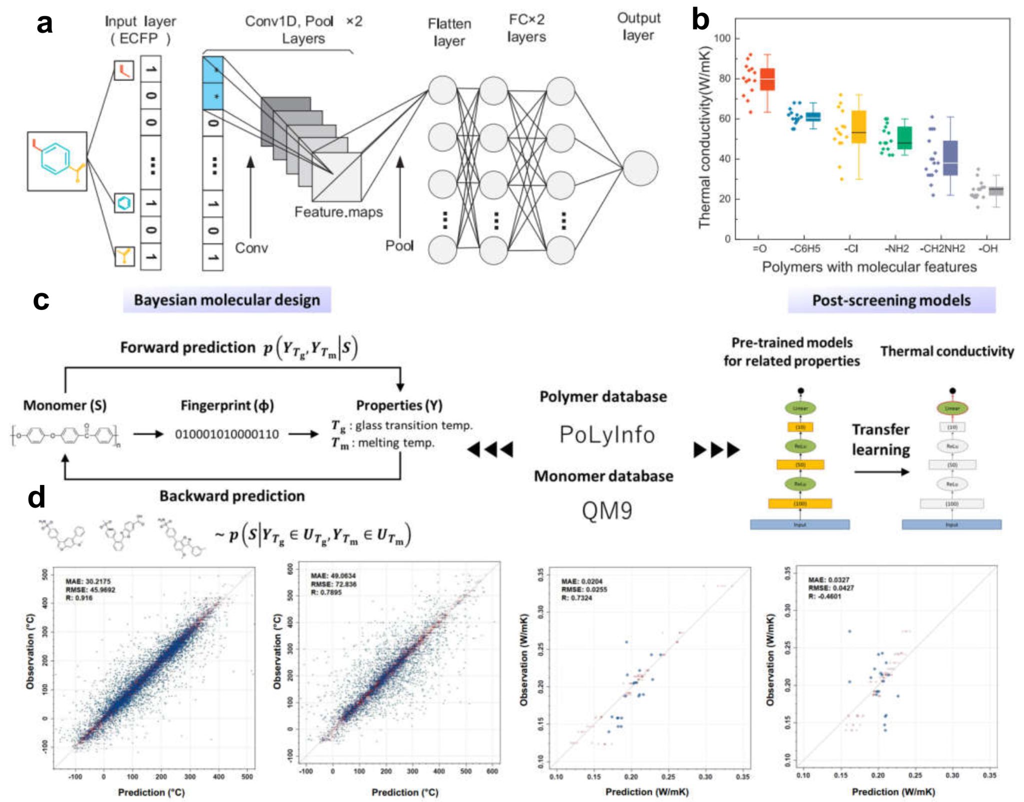 人工智能和5G的进步推动了新的散热要求的出现,强调了高性能仿生智能热管理材料的必要性。在电子设备性能优化与寿命提升领域,新型热管理材料的开发已成为关键课题。机器学习技术的快速出现进一步加剧了开发新型热管理材料的迫切需要,这为推进新型热管理材料的发展提供了前所未有的机会和平台。在早期的研究中,科学家主要依靠实验方法和理论计算来研究热管理材料的导热性,这不仅耗时耗力,而且在处理复杂的数据集和多因素关系时也会遇到限制。机器学习的出现彻底改变了这一范式。通过分析现有材料性能和结构数据的广泛数据集,训练机器学习算法来模拟材料性能和关键特征之间的复杂关系。这种方法的优点在于它能够从历史数据中识别模式,从而促进对材料性能的有效预测。随着人工智能的不断进步,机器学习越来越多地应用于聚合物材料研究,其目的是预测材料性能和发现新型聚合物材料。机器学习已经超越了传统“试错”方法的局限性,通过构建复杂的模型,将材料结构和特性与基于数据驱动的见解所需的性能相关联,从而解决了与聚合物的组成和复杂结构相关的挑战。