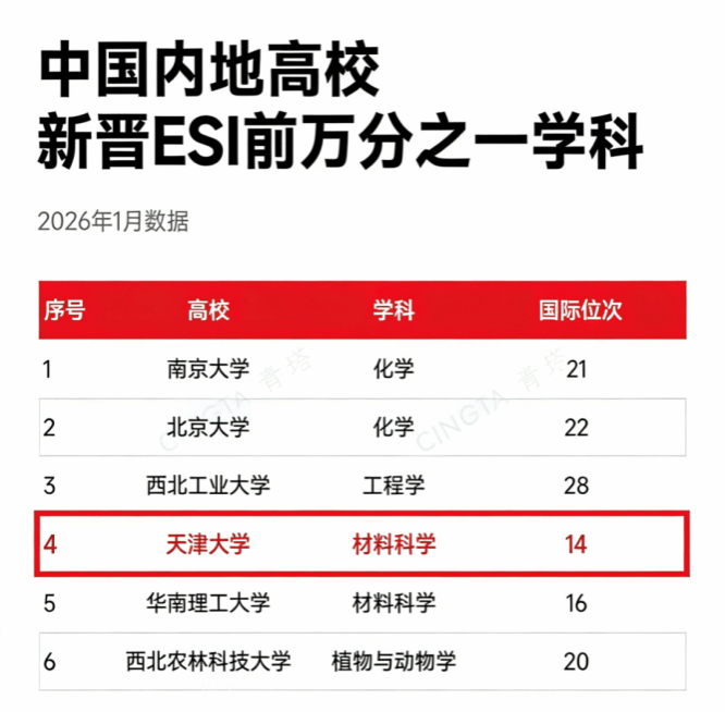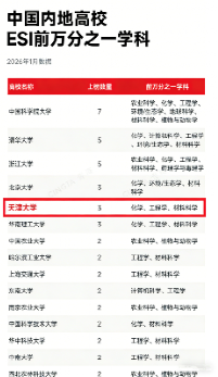 1月8日,基本科学指标数据库(Essential Science Indicators,简称ESI)发布的最新数据显示,天津大学材料科学学科领域位列全球科研机构的第14位,首次进入ESI全球前万分之一行列,成为我校继工程学、化学之后第三个跻身世界顶尖梯队的学科领域。同时,我校也成为中国大陆高校中少数拥有3个以上ESI前万分之一学科的高校。