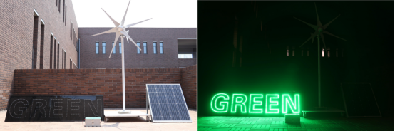 The researchers used a small prototype of a new aqueous zinc-manganese dioxide battery (bottom center) to demonstrate its ability to store renewable energy on the grid. At night, it powers a sign.