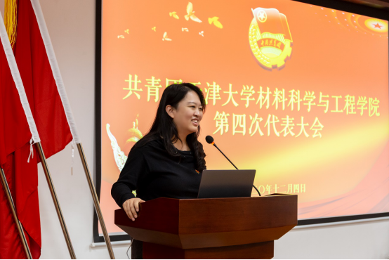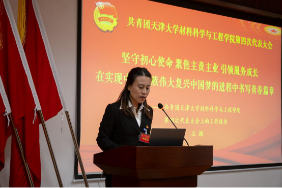 材料科学与工程学院团委书记王颖代表共青团天津大学材料科学与工程学院第三届委员会作了题为《坚守初心使命,聚焦主责主业,引领服务成长,在实现中华民族伟大复兴中国梦的进程中书写青春篇章》的工作报告。报告回顾了近五年来材料科学与工程学院团委以习近平新时代中国特色社会主义思想为指导,以学校第十次党代会精神为指引,不忘跟党初心,牢记青春使命,将政治引领、思想引领、服务引领、组织引领贯穿共青团工作始终,进一步凝心聚力,进一步深化改革,进一步开拓创新,进一步艰苦奋斗,为学校双一流建设和发展添砖加瓦,为实现“两个一百年”奋斗目标和中华民族伟大复兴的中国梦贡献天大力量。