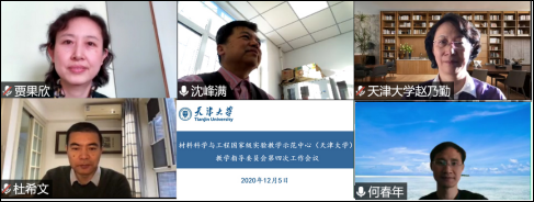 2020年12月5日,材料科学与工程国家级实验教学示范中心(天津大学)教学指导委员会第四次工作会议在线上召开。教务处副处长贾果欣、教学指导委员会主任东北大学沈峰满教授、委员天津大学赵乃勤教授和杜希文教授,材料学院副院长、中心主任何春年以及中心全体教师参加了会议。会议由沈峰满教授主持。