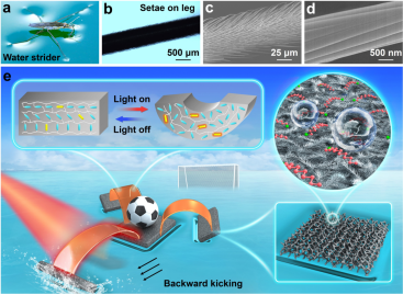 图1.自然界中的水黾及仿生水黾光驱动水上行走软体机器人