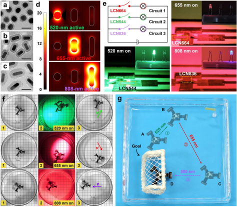 作者进一步尝试实现器件的可控多方向水上行走过程。首先通过调控MiniGNRs的尺寸,合成了三种吸收峰分别位于544、664和836 nm的MiniGNRs纳米单体,它们能够分别响应520 nm绿光、655 nm红光以及808 nm的NIR,并进一步通过自由基聚合将它们分别原位交联到LCN中。在不同波长的光照下,只有与其波长相匹配的MiniGNRs-LCN薄膜才会发生弯曲形变,证明了掺杂不同MiniGNRs的LCN薄膜具有选择性光响应性(如图5)。基于此,研究人员最后制备了一个三“腿”水上行走软体机器人。在不同波长的光照下,器件能够分别朝着三个不同方向运动,并将其应用于定向的物体运输。