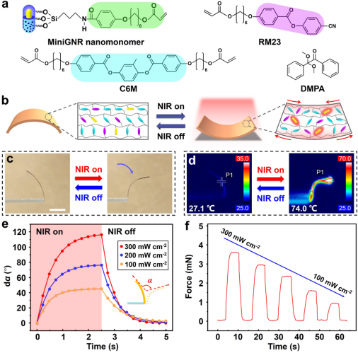 为了实现MiniGNRs在LCN中的均匀分散,研究人员依次通过包覆介孔二氧化硅、氨基功能化和有机小分子6OBA的共价键合,设计并制备了一种可聚合的MiniGNRs纳米单体(如图2)。之后通过MiniGNRs纳米单体与液晶单体的原位自由基聚合制备了一个光响应的MiniGNRs-LCN复合薄膜(如图3)。薄膜内部具有展曲取向,在NIR照射下,光热效应引发液晶基元的有序度降低,使薄膜平行取向一侧收缩,垂直取向一侧膨胀,进而实现了快速可逆的弯曲形变。当光强为300 mW cm-2时,薄膜表面温度在2.5 s内可达74 ℃,弯曲角度可达116°。