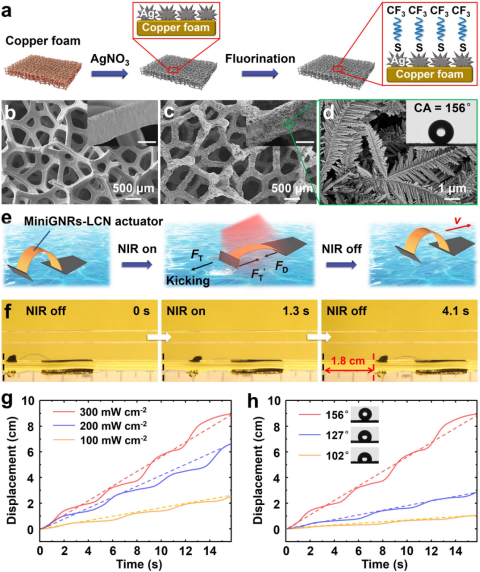 光驱动MiniGNRs-LCN复合薄膜的快速弯曲形变可为器件提供驱动力。此外,为使器件具有水上漂浮能力,研究人员以泡沫铜为基底制备了具有微纳分级结构的超疏水表面,并将其与MiniGNRs-LCN复合薄膜组装到一起,制备了一个仿生水黾的水上行走软体机器人(如图4)。在NIR照射下,薄膜迅速发生向下的弯曲,同时向后产生一个瞬时的推力,进而驱动器件向前运动。关闭NIR后,器件逐渐停止运动,通过周期性开关NIR,能够实现器件持续的水上行走过程。