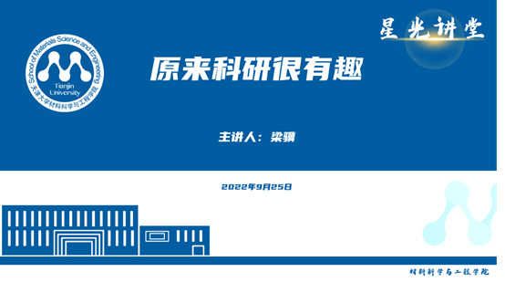 “在科研中,我们要学会正确面对负面结果,善于发掘正面信息,尽量不要蓝瘦、香菇。”“只要有进步,哪怕是只每天有小小的进步或解决了小小的问题,科研都是开心的。”诙谐生动的语言、深入浅出的讲解,9月25日下午,国家级青年人才、天津大学材料学院教授梁骥以《原来科研很有趣》为题,“云”带领学院近290名一、二年级本科生和部分研究生,开启了一场解锁科研奥秘、规划学业生涯的发现之旅。