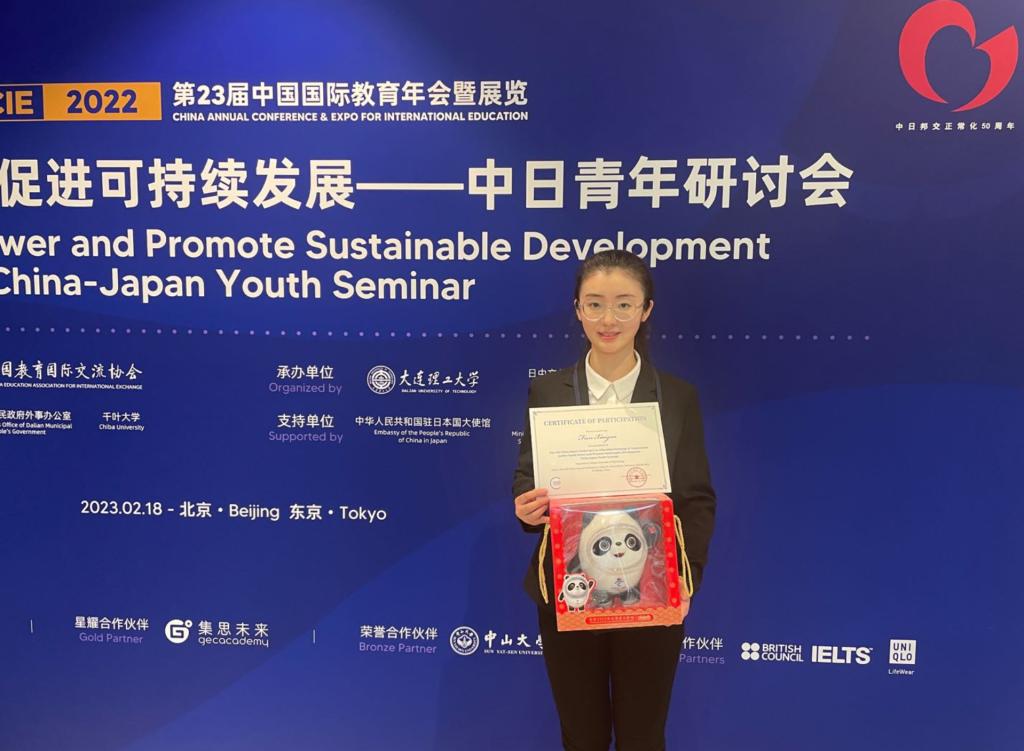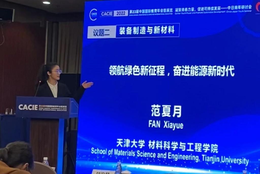 2月18日,材料学院博士生范夏月受邀参加了第23届中国国际教育年会-中日青年研讨会,并做题为《领航绿色新征程,奋进能源新时代》的会议报告。此次研讨会主题为“凝聚青春力量,促进可持续发展”,旨在倡导中日青年关注区域合作,为助力全球发展、应对共同挑战贡献力量。中日青年研讨会作为第八届中日教育交流会的一个分论坛,邀请了中日两国高校学生紧跟相关行业需求与前沿科技发展,围绕可持续发展、装备制造与新材料、人工智能等学科开展学术交流与研讨。