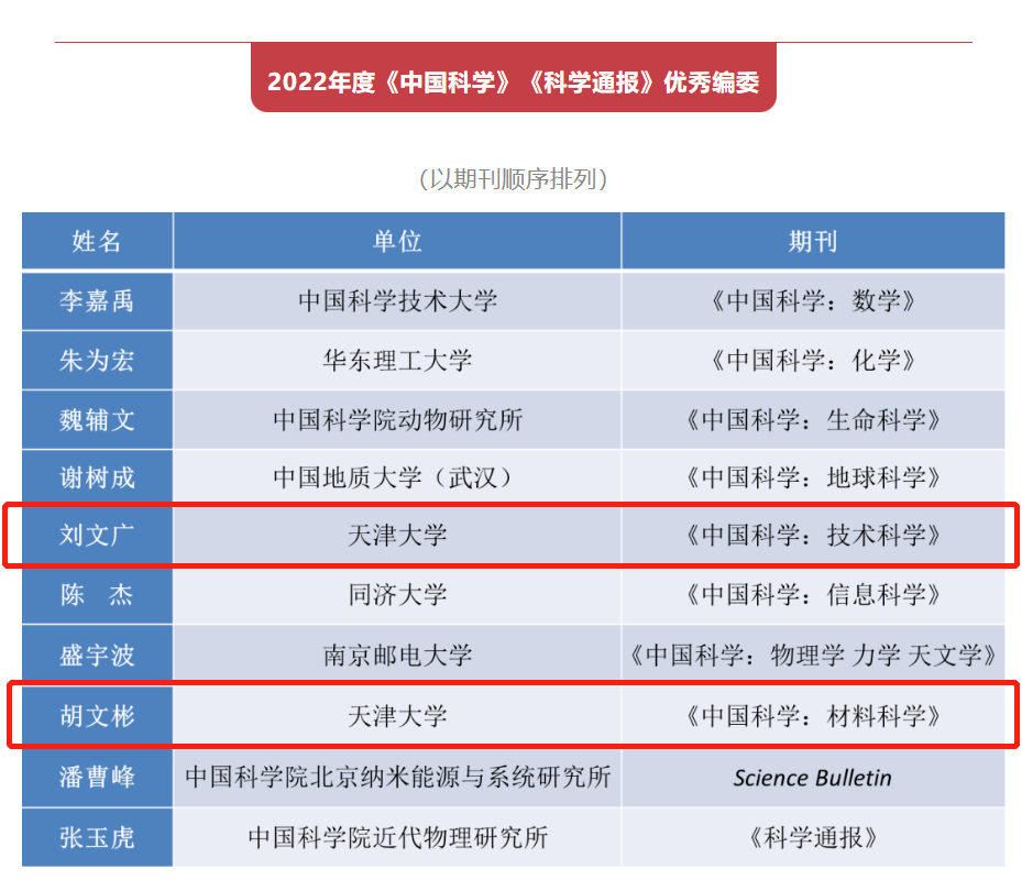 在近日召开的《中国科学》和《科学通报》(以下简称两刊)理事会上,公布了“两刊”2022年度10位优秀编委、10位优秀作者和2位优秀编辑的名单。我院胡文彬教授、刘文广教授作为天津大学唯二学者获评优秀编委。