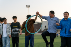 师生“手拉手”,共绘“同心圆”,在“心情是自由自在”的音乐声中,在落日余晖下,运动会拉开了序幕。第一个暖场项目是一圈到底。在“最大同心圆”上,几个呼啦圈同时传递着,像是洋溢着的青春气息在流淌,也如同师生间碰撞出的火花在迸发。师生同心聚力,团结奋勇,齐心协力,团结共进,传递着健康、激情和生机,也建立着默契、配合和友谊。以小组为单位的呼啦圈传递敦促大家一起向前进,用最快的速度将呼啦圈传到裁判员手中。敏捷的身姿,跃出青春的高度,迸发出蓬勃的力量,加油声、呐喊声此起彼伏,响彻北洋园的体育场。在小组成员的齐心协力下,在智力与体力的对决中,大家都收获了运动的快乐,师生关系也愈发紧密。夹球前进环节五人四球朝着前方,耐心细致调节奏,同频前行循规律,唯有齐心协力,方能同行致远,大家相互配合,为师生交流、思想交融、情谊互通注入不竭动力。划拳绕圈是智力与体力的比拼,连接的是团结和友爱,传递的是勇气和力量,演绎的是奋斗和拼搏,比赛趣味横生、精彩纷呈,场上场下互勉互励、氛围融洽。
