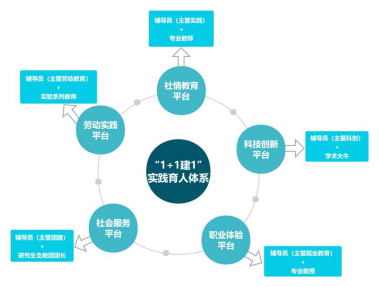 材料学院通过建设“1+1建1”实践育人模式,以1名辅导员和1名专业教师/校友/优秀学生联合建设1个实践平台的育人机制,全员参与实践活动,全过程融入实践教育,全方位构建实践载体落实“三全育人”,形成了社情教育平台、科技创新平台、职业体验平台、社会服务平台、劳动实践平台五位一体的大学生实践锻炼工作格局,共计建成以材梦扶贫实践队为代表的实践基地和育人共同体56个,遍布全国各地,为开展广泛的科技创新教育、实习实践教育、就业创业教育奠定了很好的基础。