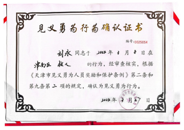 天津大学材料学院教师刘永于2024年3月8日在津南区的英勇救人行为经津南公安局推荐、见义勇为协会审核确认为见义勇为行为。津南区见义勇为协会为刘永颁发见义勇为证书。