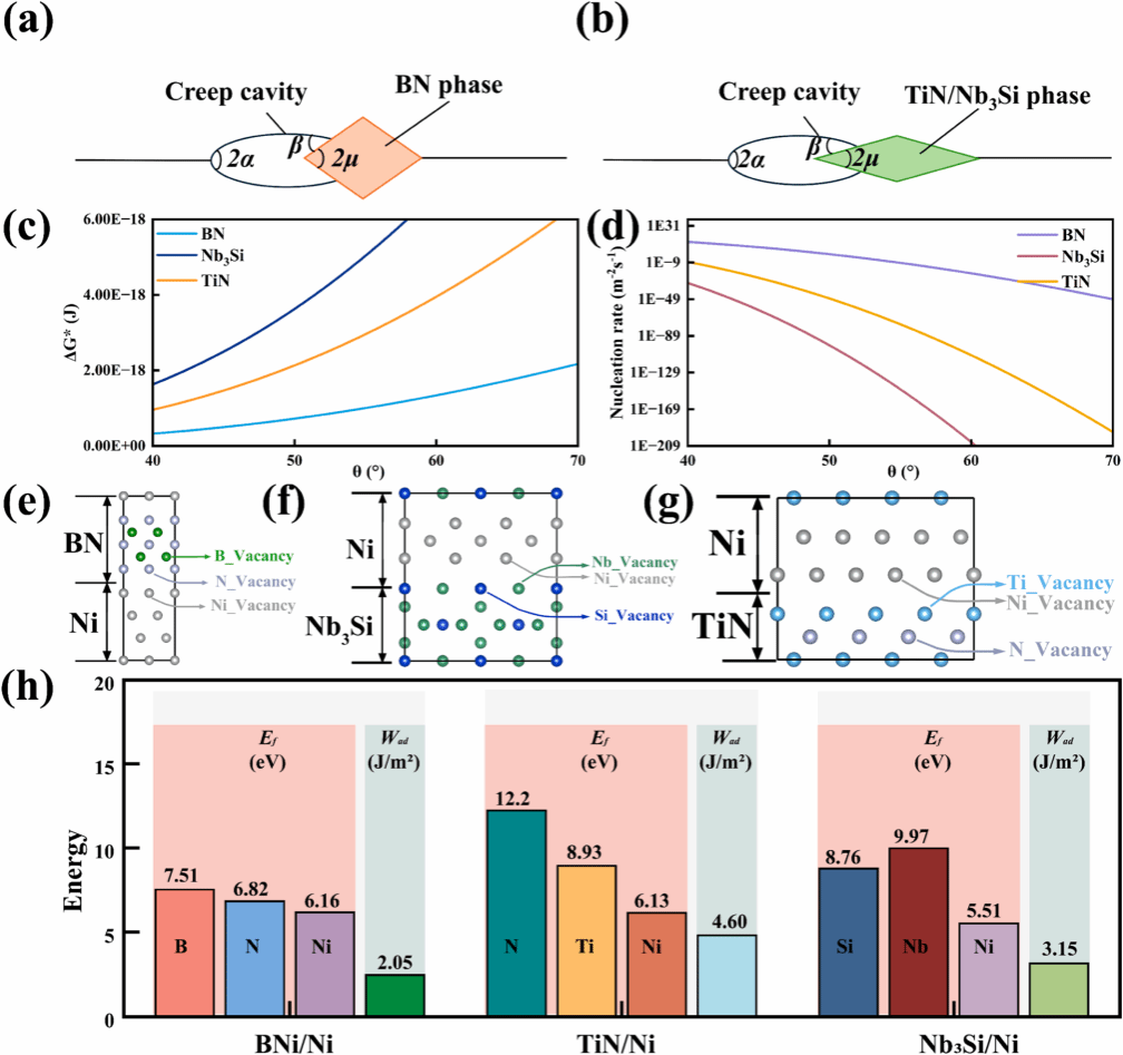 图3 BN、TiN和Nb₃Si颗粒对蠕变空洞行为的影响机制分析。(a–b) 蠕变空洞在BN与TiN/Nb₃Si颗粒处的几何关系示意图;(c) 三种相在不同夹角下异相形核的自由能变化;(d) 三种相在不同夹角下的形核速率;(e–g) BN、Nb₃Si、TiN与Ni界面上的空位分布示意;(h) 三种相与Ni界面的成核能垒 (E_f)、界面结合能 (W_ad) 和不同元素形成空位的形成能对比,显示Nb₃Si/Ni界面具有更低的空位形成能和较高的界面结合能,有助于抑制空洞的形成与扩展。