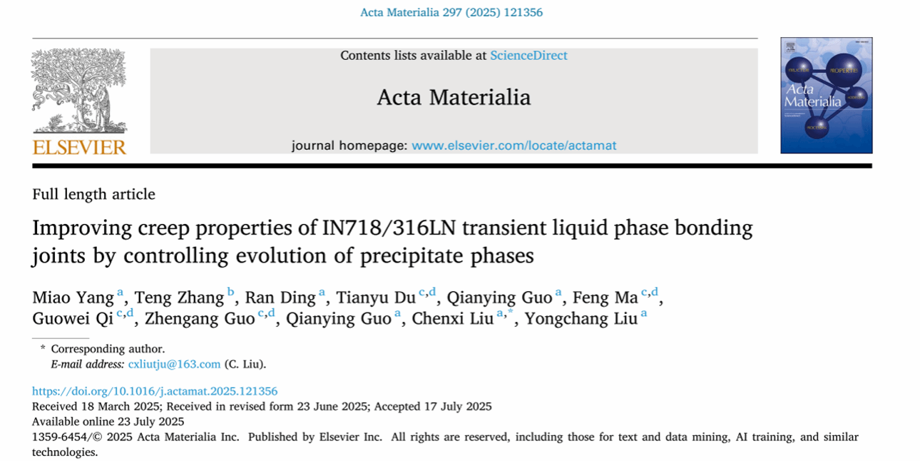 文章信息:M. Yang, T. Zhang, R. Ding, T. Du, Q. Guo, F. Ma, G. Qi, Z. Guo, Q. Guo, C. Liu, Y. Liu, Improving creep properties of IN718/316LN transient liquid phase bonding joints by controlling evolution of precipitate phases, Acta Mater. 297 (2025) 121356.