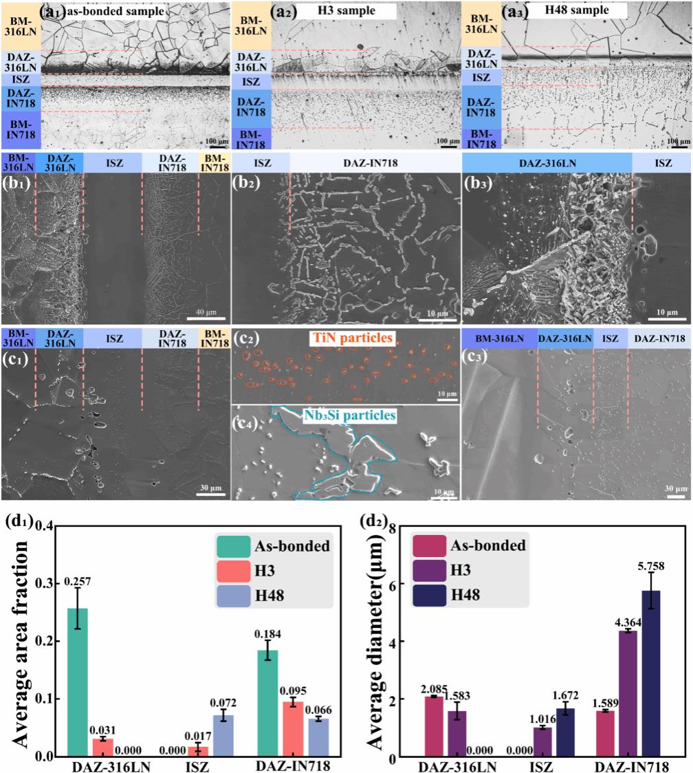 图2 不同热处理状态接头的显微组织及析出相特征对比。(a1–a3) As-bonded、H3与H48样品的接头截面光学显微照片;(b1–b3) 不同区域的SEM形貌;(c1–c4) TiN颗粒与Nb₃Si颗粒的典型形貌;(d1) 各区域析出相的平均面积分数;(d2) 各区域析出相的平均粒径。
