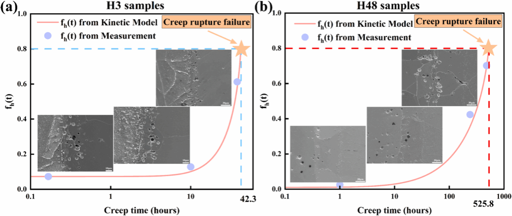 图4 H3与H48样品蠕变过程中空洞面积分数 fh(t) 的演化趋势与模型拟合。(a) H3样品蠕变过程中实测与动力学模型预测的空洞面积分数随时间变化;(b) H48样品对应变化规律。插图为不同蠕变时间下的SEM微观形貌,显示空洞随时间逐渐增大并聚集,最终导致蠕变断裂。动力学模型良好拟合了实验数据,验证了空洞演化主导蠕变失效的机制。