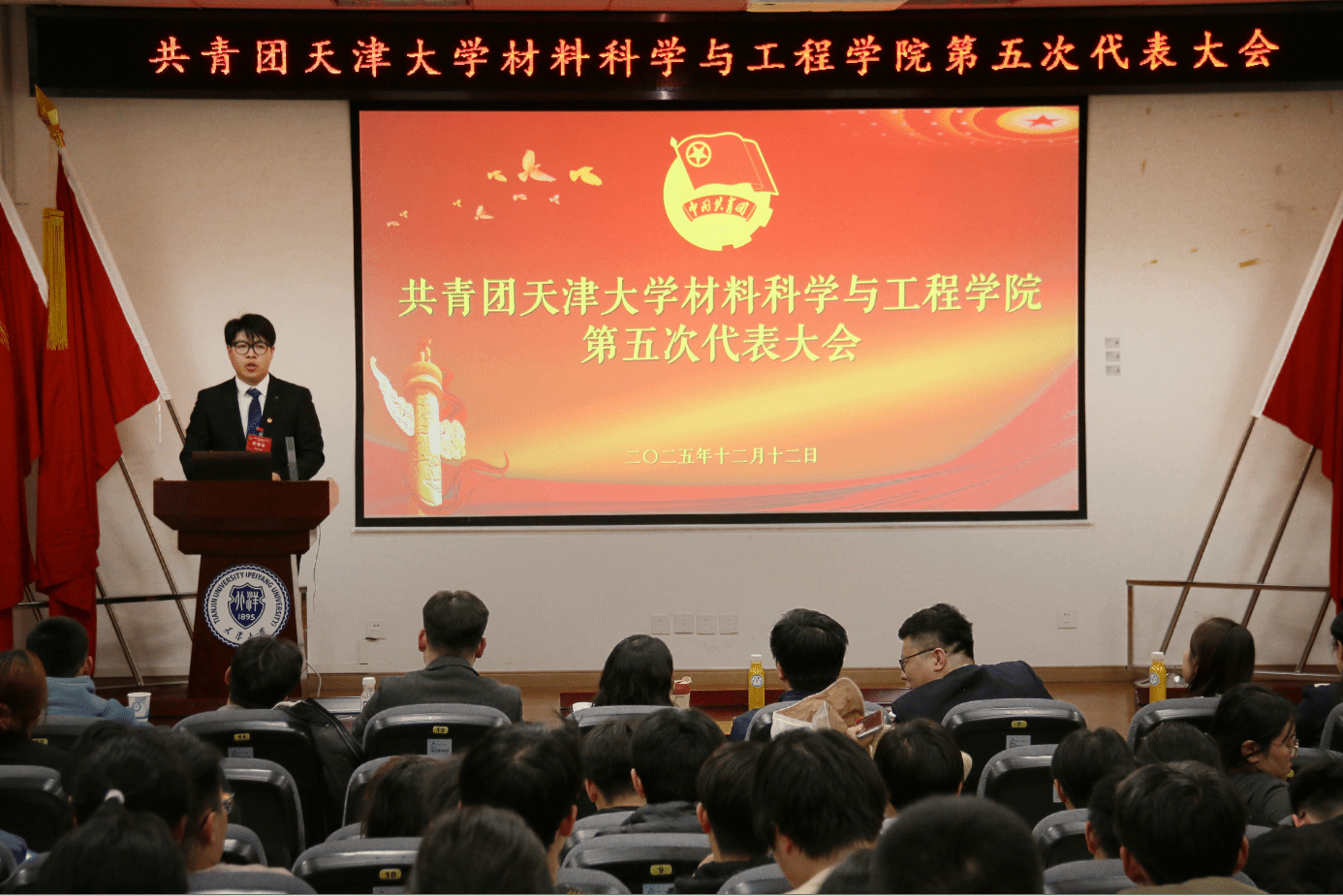 2025年12月12日,共青团天津大学材料科学与工程学院第五次代表大会在31教泰凯英报告厅隆重召开。天津大学团委书记李一昂、材料学院党委副书记王颖出席会议,智算学部、马克思主义学院等兄弟院系团委负责同志到会祝贺,学院专职团干部和团员代表共118人参加会议,会议由材料学院辅导员刘春旺主持。