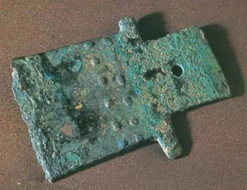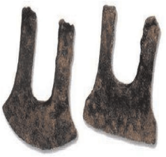 1974年,河北真城出土一件商代铁刃铜钺(图11),经过鉴定,证明是用含镍约6—8%的预铁锻成铁刃后,和钱体铸接而成。这件历史文物的发现,说明早在公元前,我国劳动人民不仅已初步认识并使用了铁,而且掌握了较高的锻打和铜铁双金属铸接技术。但是由于殷周反动奴隶制严重阻碍社会生产力发展,直到春秋战国之交,封建制替代奴隶制的社会大变革时期,治铁技术才真正得到发展。